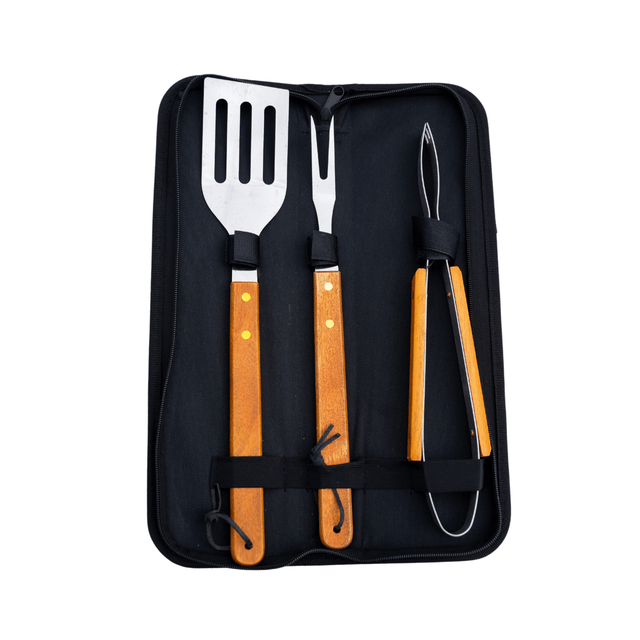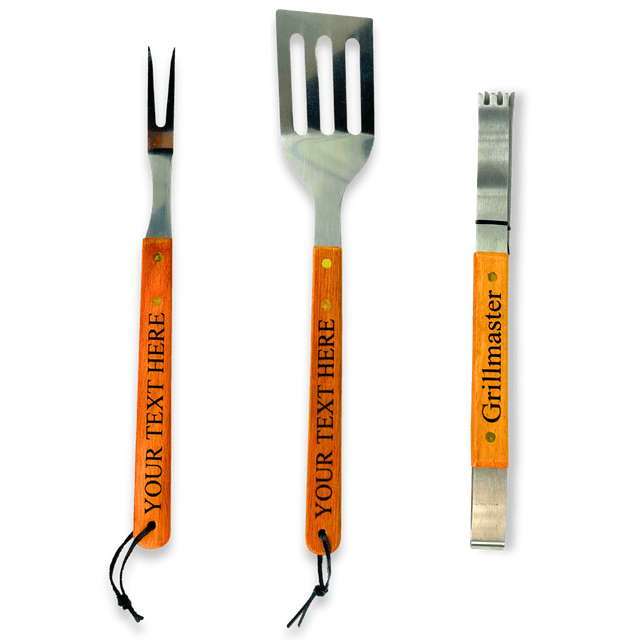Take your grilling to the next level with our custom laser-engraved BBQ set. This premium set includes all the essential tools plus a nylon carry bag. Each one expertly engraved with your choice of text.