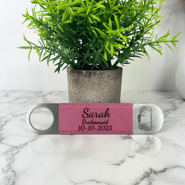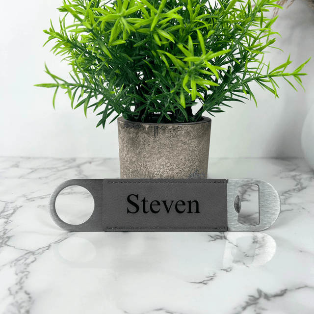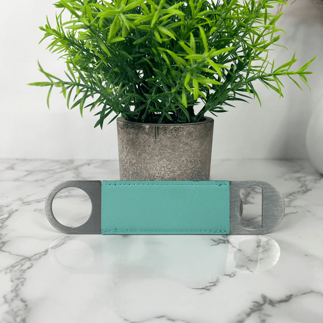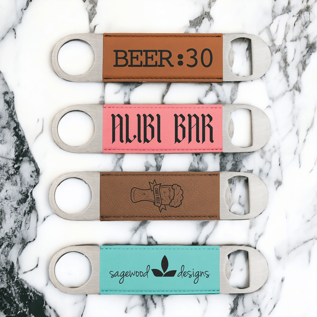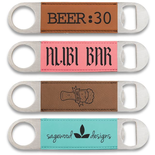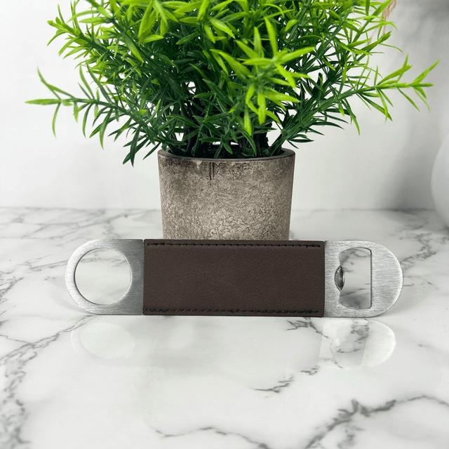 Discover our 1 1/2" x 7" Bottle Opener with Leather Grip. This sleek and functional bottle opener features a luxurious leather grip. Choose your color and make this tool yours, adding a touch of sophistication to your beverage experiences
