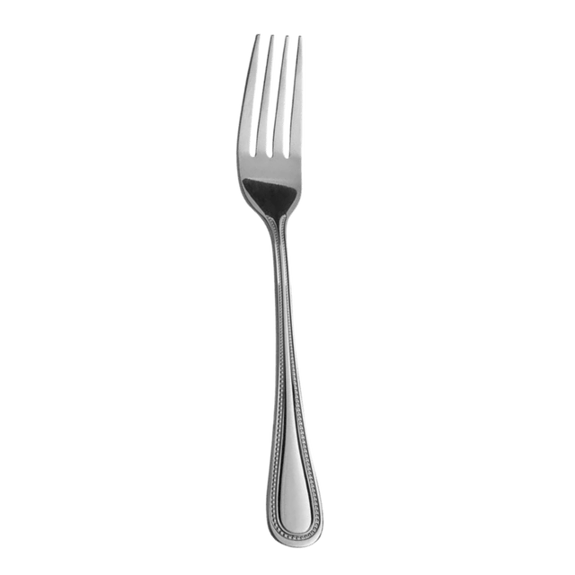7 5/8" 18/0 Stainless Steel Dinner fork with Custom Laser Engraving. This fork features a beaded edge and a subtle, classic design, making it versatile enough for casual meals or special occasions. The fork can be laser engraved with up to 2 lines of text, offering a personalized touch for your customers. Whether for events, gifts, or everyday use.