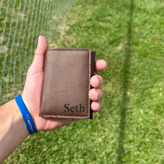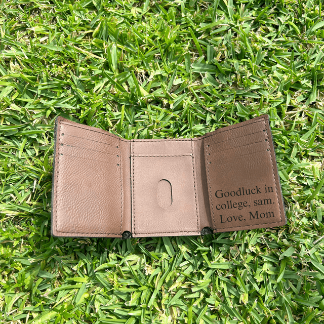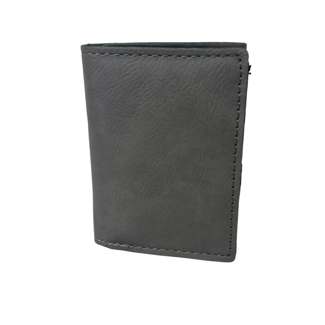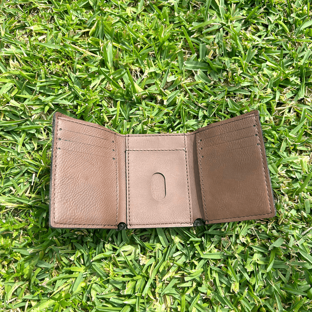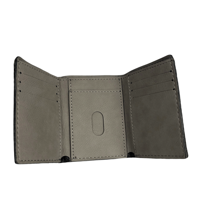 Our Trifold Wallet: Compact in size, measuring 3x4 inches, it's a perfect blend of style and functionality. Crafted from Laserable Leatherette, It's not only richly textured but also water-resistant, easy to clean, and built to endure daily weather.
